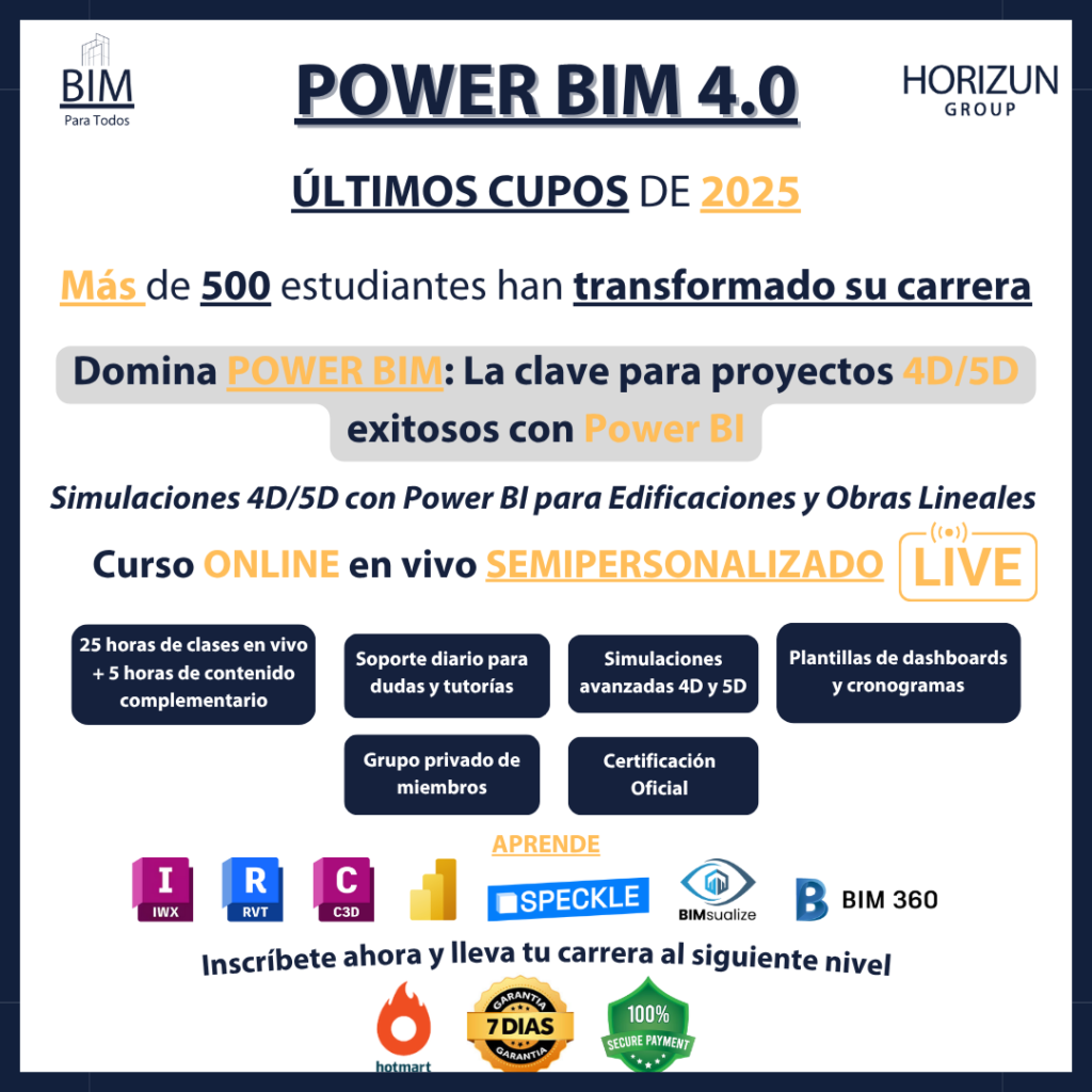 • Uso avanzado de herramientas como: InfraWorks, Civil 3D, Revit, Power BI, Specke, BIMSualize, Data Exchange y BIM 360.